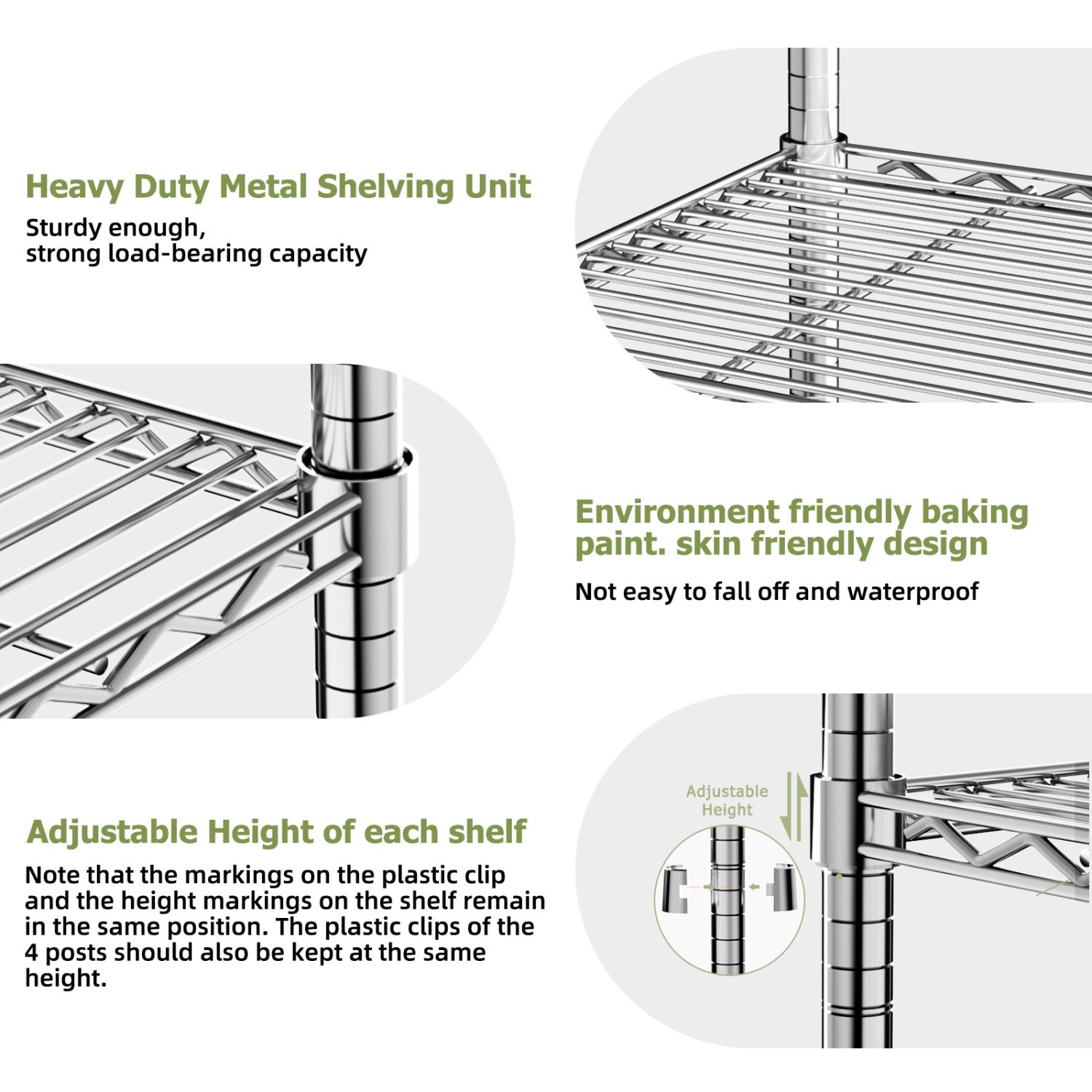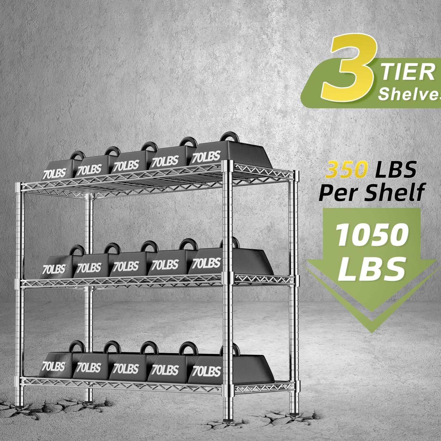 Heavy-Duty 350LB Capacity per Shelf: Industrial-grade steel construction with thick wires and reinforced crossbars supports up to 350 lbs per tier—ideal for tools, appliances, or bulk storage.